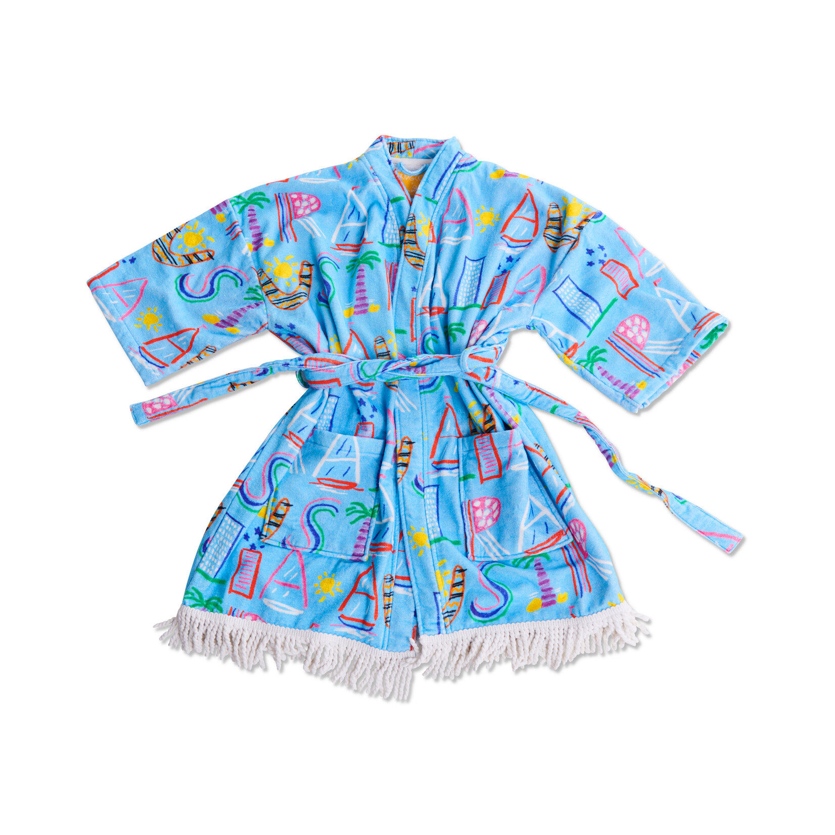 Our robes are always a smash hit, and combined with the effervescence of Ken Done we think you'll love our latest. The Kip&Co x Ken Done Australia Mate Terry Mini Bath Robe is the perfect piece for post swim, the get ready routine or general home lounging. Made from soft 100% organic cotton terry, this comfy robe features Australia spelled out in pastel illustrations of sailboats, boomerangs, palm trees and coastal high rise buildings on a blissful sky blue base, in and ode to our lucky country!